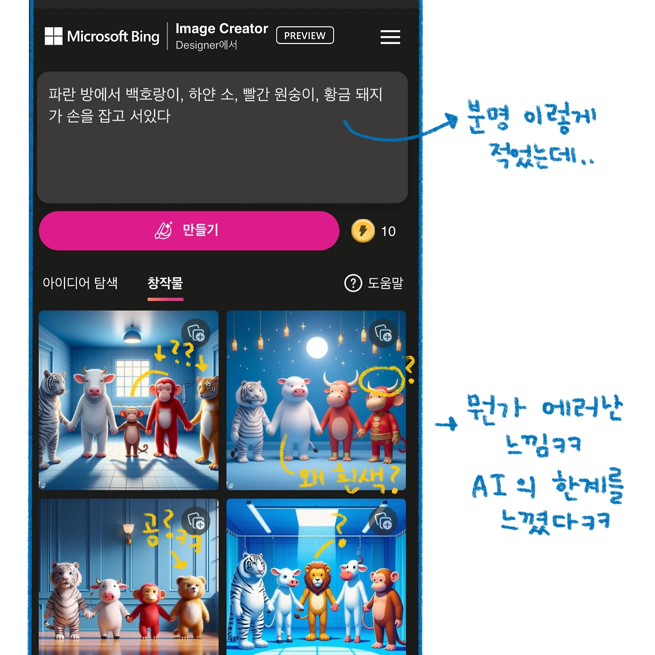 요구사항이 길어지니 버벅거리는 AI 이미지 생성기!ㅋㅋㅋ