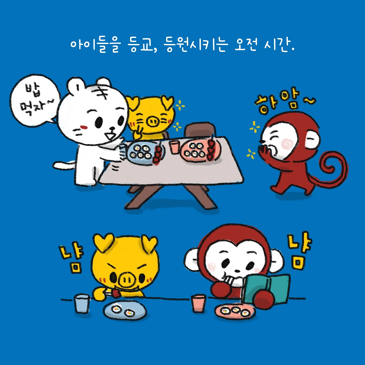 소띠 아빠, 호랑이띠 엄마, 원숭이띠 딸, 돼지띠 아들. 소소한 육아와 일상 이야기를 그리고 있습니다.