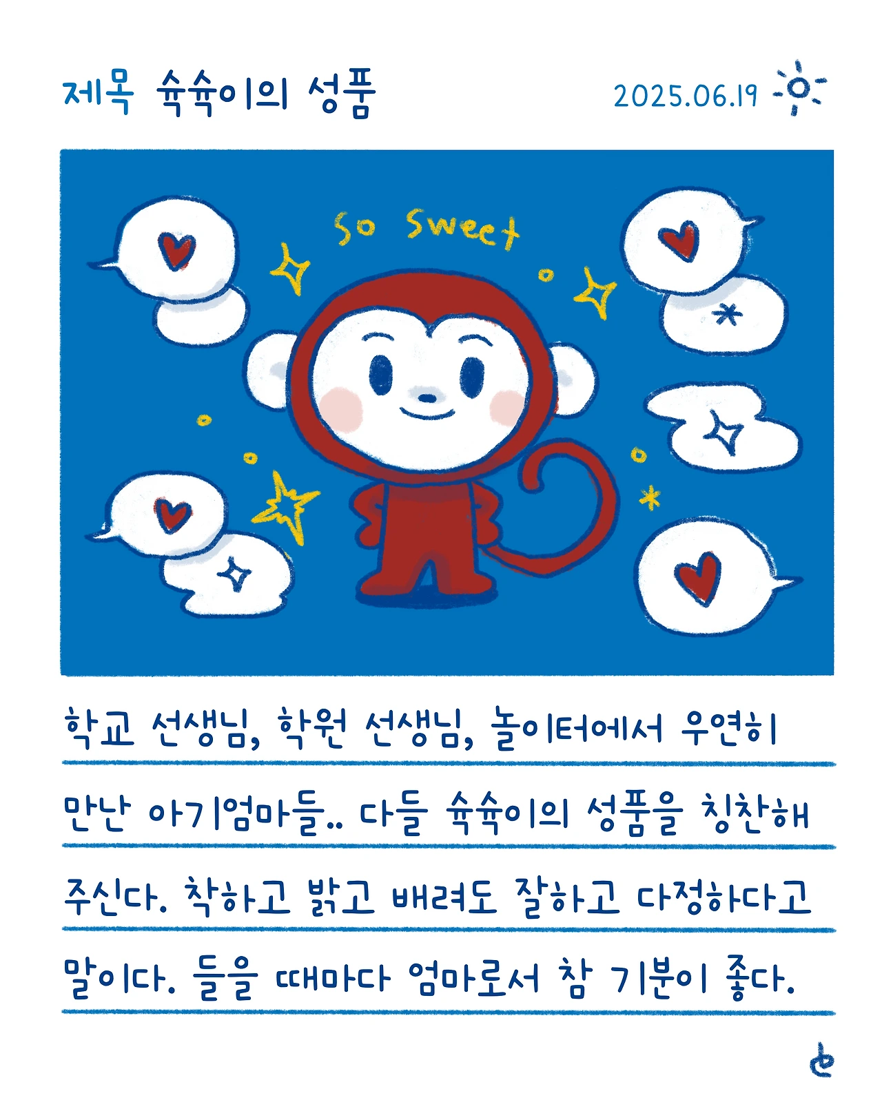 어제도 놀이터에서 처음보는 어머니가 날 찾아오더니 슉슉이 엄마냐고 아이가 너무 다정하고 착하다고 폭풍칭찬을 하셨다.