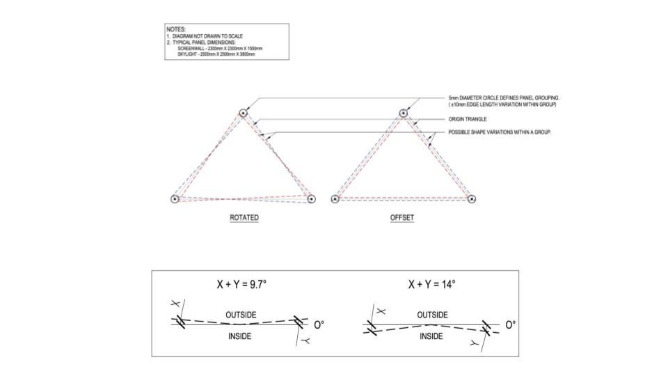 이제 문제는 어떻게 글라스 모듈을 나누는 지였다. 처음에는 회전축을 눕힌 것과 상관없이 지붕면과 수평인 것으로 나누었다. 이럴 경우에 모든 글라스의 형태와 곡면은 다른 형태가 된다.