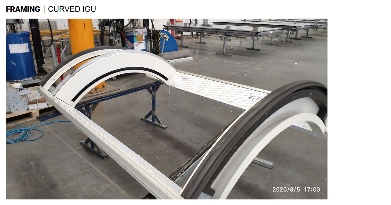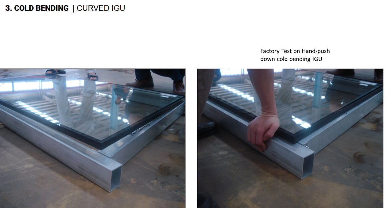 이는 완전히 만들어진 평평한 IGU(복층유리)를 사용한다. A4종이를 세워보면 종이가 자연스럽게 휘어지는 것을 볼 수 있다. 보통 1.5m x 4m 크기의 복층유리도 세워놓으면 어느 정도 휘어지는 것을 볼 수 있고 이 작은 허용 휘어짐을 이용해서 조금씩 휘어서 만들면 전체적으로 곡면을 만들 수 있다.