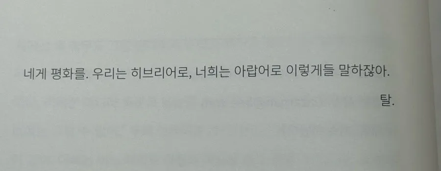작가님이 어느 쪽에도 기울지 않고 써 내려간 탈과 니암의 편지들에서 살아 숨 쉬는 두 인물을 본다. 살아 숨 쉬는 이들이 존재함을 다시 깨닫는다. 단순히 두 국가의 갈등을 나열한 글들과는 다르게 다가온다. 그래서 머리를 맞은 것 같았다.