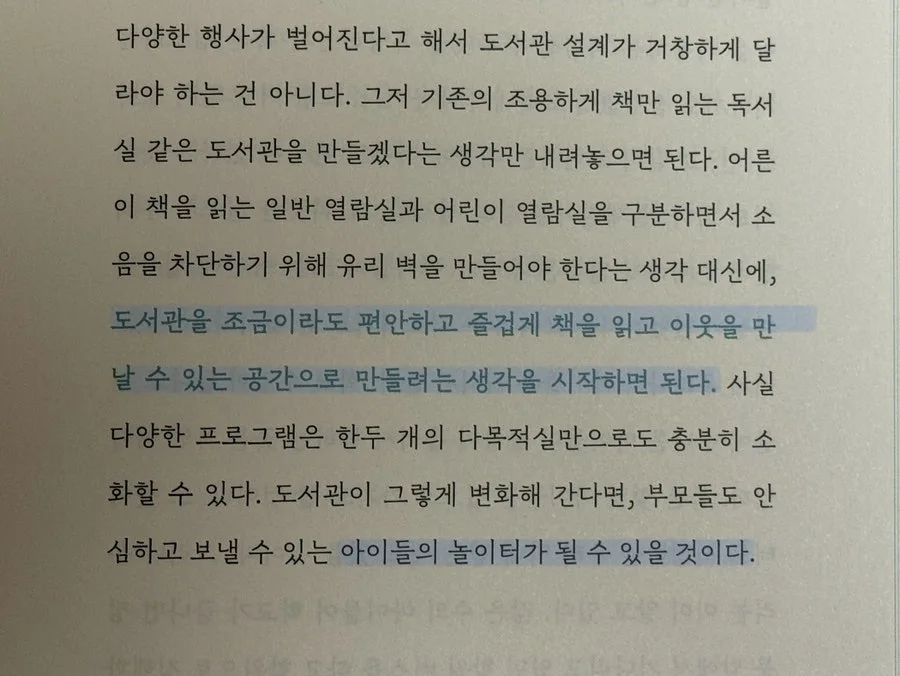 특히 도서관에 대한 의견이다. 작은 도서관이 좋다는 작가님의 의견에 '큰 도서관이 장서 양도 많고 더 쾌적하지 않나...?'라고 집 근처에 대형 도서관을 둔 입장에서 약간 의구심을 품었는데, 그 뒷 내용을 읽어보니 작은 도서관도 괜찮겠다, 싶었다. 큰 도서관은 질서를 유지하려면 어쩔 수 없는 규칙과 규율이 많이 생기게 되는데 오히려 작은 도서관이면 조금이라도 더 편하고 아늑한 공간으로 역할할 수 있지 않을까? 하는 생각이 들었기 때문이다.