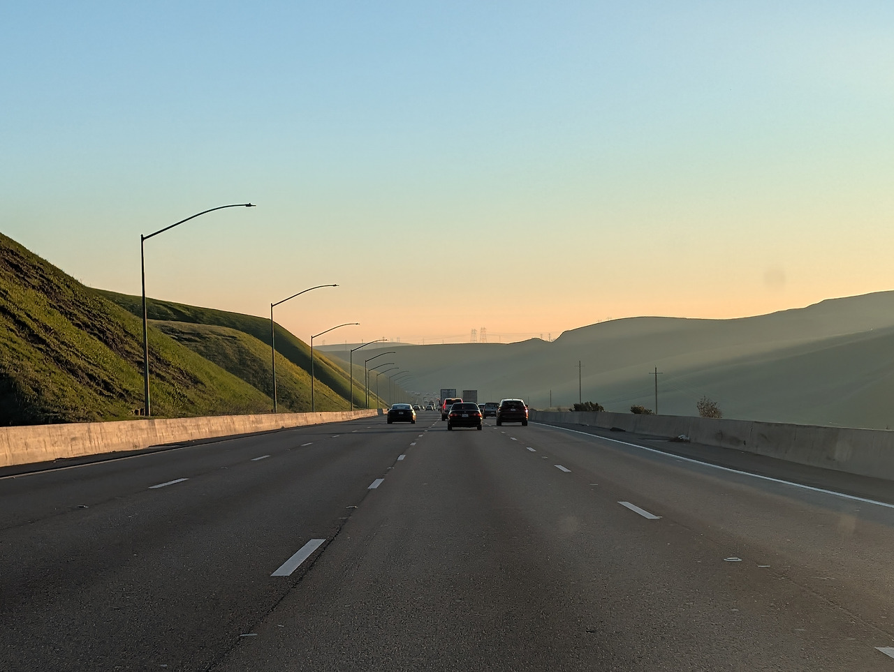 그렇게 한 시간 정도를 달렸을까. 저 멀리 산등성이 위로 여명이 밝아오기 시작했다. 오렌지빛 라인이 짙은 어둠을 밀어내더니 곧이어 웅장한 황금빛 아치를 그리며 태양이 고개를 내밀었다. 서서히 검은색 실루엣만 보이던 풍경들이 캘리포니아 겨울 특유의 푸르른 녹음으로 옷을 갈아입는 장관이 펼쳐졌다. 시야가 환하게 밝아지면서 새벽 운전의 피로가 씻겨 나가는 듯한 상쾌함이 찾아왔다.