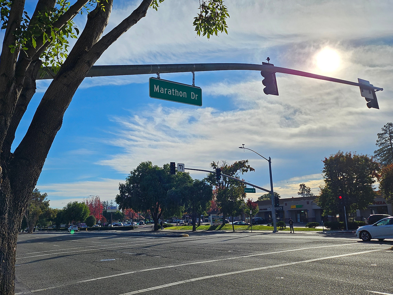 약 8km쯤 달렸을까, 드디어 빨간불이 내 발목을 잡았다. 거친 숨을 몰아쉬며 땀을 닦고, 무심코 고개를 들어 표지판을 본 순간, 나는 온몸에 전율이 일듯 소름이 돋았다. 초록색 표지판에 선명하게 적힌 하얀 글씨. Marathon Dr.(마라톤 길) , 애비뉴(Avenue), 불러바드(Boulevard), 로드(Road), 웨이(Way)… 수많은 길의 단위 중에서도 드라이브(Drive)는 묘하게 역동적이고 낭만적이다. 내가 사는 이 넓은 산호세의 그 수만 개의 길 중에서, 오늘 유일하게 나를 멈춰 세운 곳이 하필 마라톤 길이이라니.