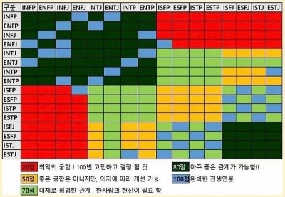 MBTI를 대체할 만한 것이 아직 등장하지 않아서인지 여전히 사람들은 MBTI를 묻는다. MBTI로 잘 맞는 사람과 잘 맞지 않는 사람을 구분한다. 조금만 검색해 보아도 MBTI별 최고의 궁합과 최악의 궁합을 순위별로 선정하고 이유까지 자세히 분석되어 있는 것들을 쉽게 볼 수 있다. 흔히 F와 T는 너무 다르기 때문에 상처받기 쉽다고 하는데 F와 T 보다 S와 N의 조합이 서로를 이해하는 것에 있어 엄청난 어려움을 겪는다는 글을 본 적이 있다. 같은 내용에 대해 이야기하고 있음에도 불구하고 서로 사고하는 과정 자체가 달라서 이해도 어렵고 오해도 쉽게 생긴다고 한다. MBTI를 통해 서로 잘 맞을지의 여부를 미리 판단하고 관계를 만들어 나갈지 중단할지를 결정하기도 한다. 사람을 네 종류의 혈액형으로 구분하던 때보다는 훨씬 나은 판단의 도구인 것은 분명 하지만 성격유형 검사 하나로 상대의 너무 많은 것을 섣부르게 판단하는 것은 아닌가 하는 생각도 든다. 대부분은 잘 맞을지의 여부가 시작의 가장 중요한 요소인 것 같다.