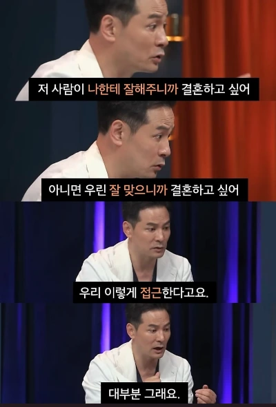 김창옥 강사님은 말한다. 처음에 남자가 맞춰주는 거 계속 그러기는 힘들다. 그러니 상대가 감정적으로 잘해주는 것보다 이 사람은 나한테 있어서 참 고맙고 좋은 사람이다. 좋은 사람이라서 내가 좀 더 손해 봐도 괜찮다. 그런 마음이 드는 사람과 결혼하는 것이 좋다고. 이 부분에서도 등장한다. 나한테 잘해주니까, 나와 잘 맞으니까 결혼하고 싶어라는 마음들. '잘 맞으니까'라는 부분은 안정감과 행복감을 주지만 그것만으로 오랜 시간 관계를 유지하는 것이 가능할까? 슬픔과 고통의 감정을 느껴본 사람이 행복의 감정을 알 수 있는 것처럼 잘 맞지 않는 부분들을 극복해 본 사람이 더 사랑을 느낄 수 있지 않을까? 나랑 잘 맞는다는 게 중요할까 아니면 상대를 사랑한다는 마음이 중요할까?