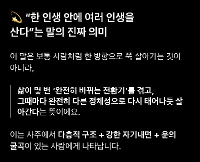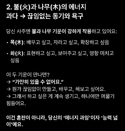 하고 싶은 것이 너무도 많은 나를, 전환기를 몇 번 맞이했던 나의 삶의 시간을 고작 태어난 날짜와 시간 같은 기본 정보로 알아냈다는 것이 너무도 소름 돋아 '이거 뭐지?' 하며 수도 없이 묻고 또 묻는 과정을 통해 어느 정도의 흥분을 해소하였다. 나의 결론은, 이것이 나의 한계이거나 정해진 운명 혹은 정답은 아니니 참고사항으로 남겨두기로 했다. (결론을 담담히 말하는 것 치고는 너무 열심히 파보긴 했지만)