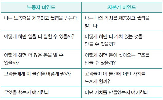 자본주의는 제로섬(Zero-sum) 게임이다. 누군가 더 가져가면 누군가 덜 가져가는 사람이 생긴다. 패자가 생길 수밖에 없는 구조다. 생각을 바꾸는 것만으로도 승리할 가능성을 높일 수 있다. ‘어떻게 하면 일을 더 잘할 수 있을까?’, ‘어떻게 하면 더 많은 돈을 벌 수 있을까?’ 식의 접근은 노동자 마인드다. ‘어떻게 하면 더 가치 있는 것을 만들 수 있을까?’, ‘어떻게 하면 돈이 찾아오는 구조를 만들 수 있을까?’가 자본가 마인드다. 어떻게 하면 더 가치 있는 일에 에너지를 쏟을 수 있을지, 어떻게 더 가치 있는 일을 할 수 있는 역량을 기를지 고민하자.