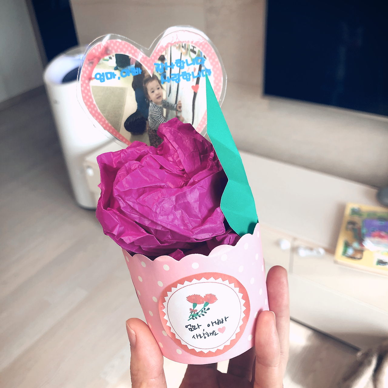 에필로그] 바다는 자신이 가져온 종이 카네이션이 신기한지 이리저리 만져보다 찢기 시작했다. 이 감동을 아빠가 퇴근하면 함께 나누고 싶은 엄마는 최선을 다해 바다를 말려본다. 그래, 역시 이 사랑을 알아줄 거란 생각은 엄마의 착각.