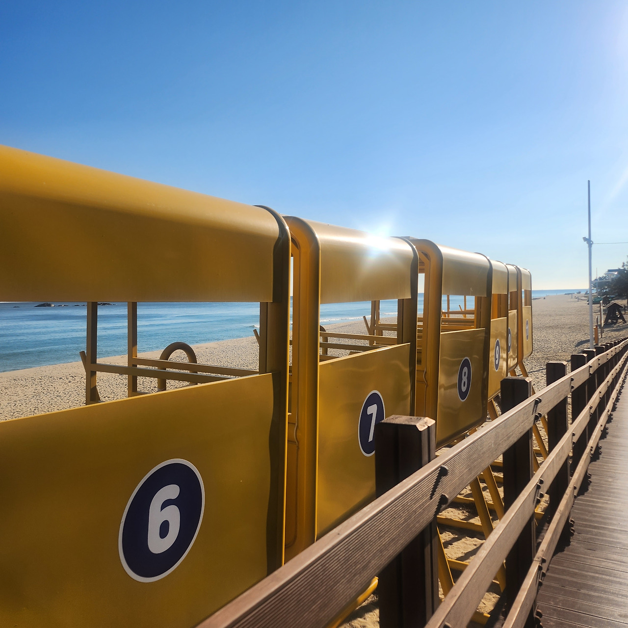 바쁜 한여름을 보내고 한쪽에서 줄지어 쉬고 있는 구조대의 사다리 의자들