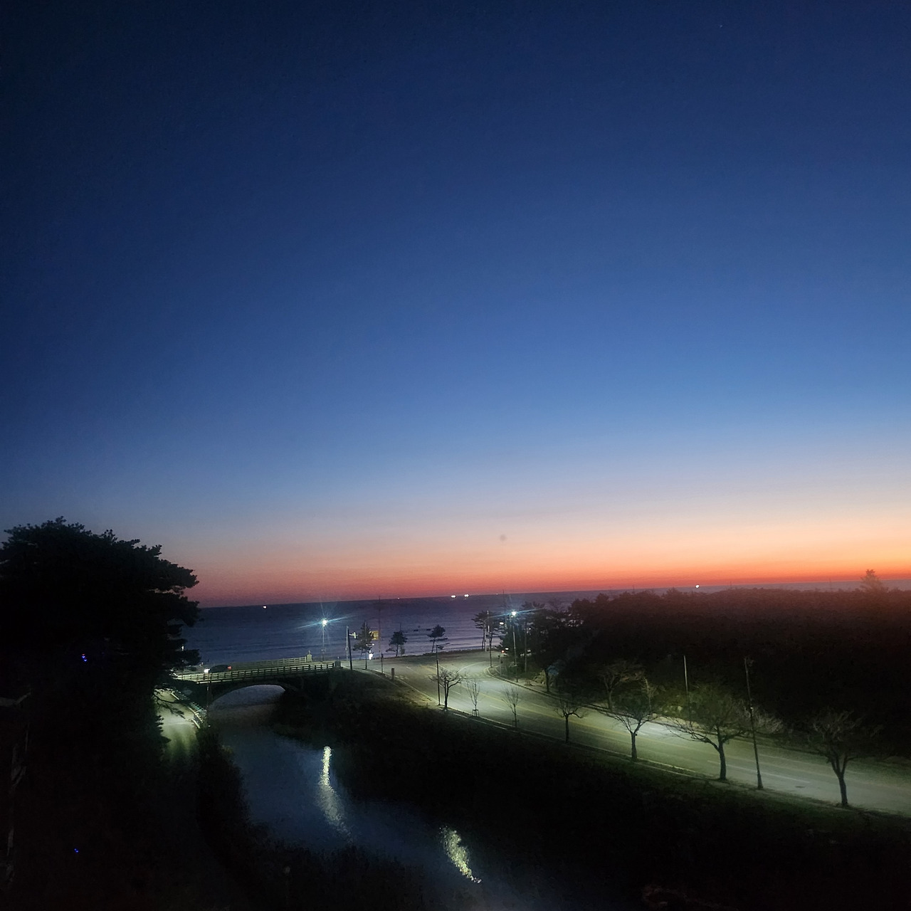 숙소에서 바라봤던 해뜨기 전 동해 하늘과 바다