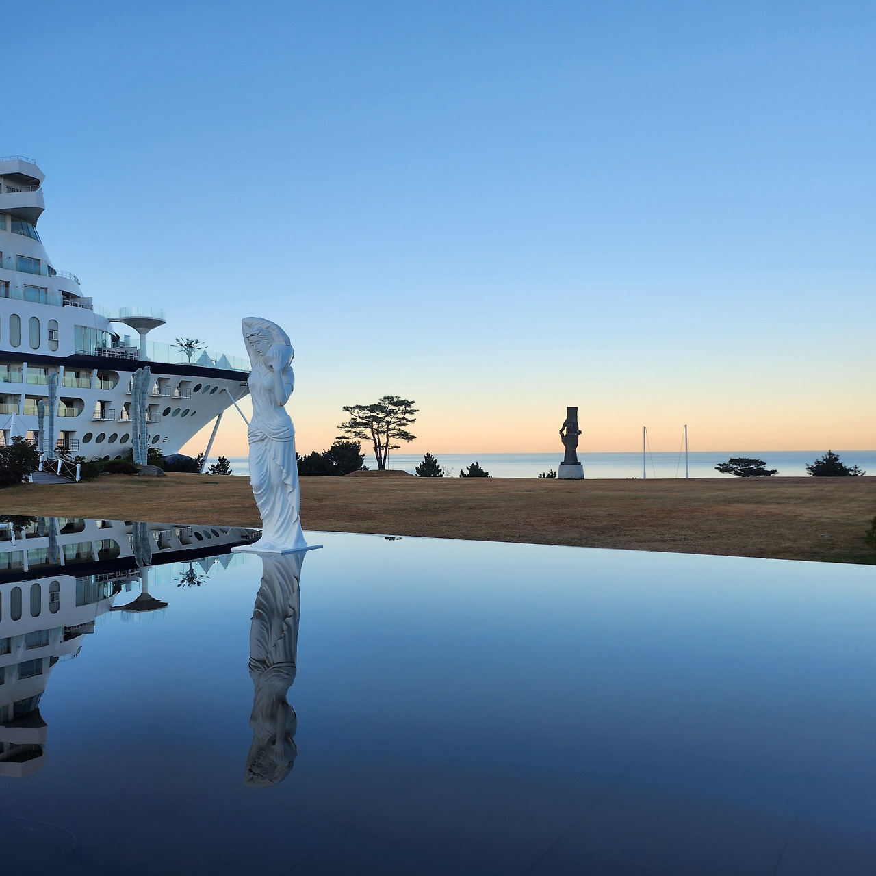 낡은 버스 안은 교복을 입은 학생 한 명 외에는 장바구니 카트들과 무엇인가 담긴 가마니들을 손에 꼭 쥐고 앉아 계신 할머니, 할아버지들로 가득했다. 꾸벅꾸벅 졸고 있는 어린 학생과 장에 다녀오시는 어르신들의 일상에 갑자기 올라탄 나의 여행자 행색이 이질적으로 느껴졌다. 창 밖으로 바다가 보이는 해안길을 지나 정동진 역과 가장 가까운 정류장에서 내려 미리 예약해 둔 숙소로 걸었다. 엄마가 가보고 싶어 했던 선박 모양의 호텔이었는데 비수기인 건지 가격이 많이 할인되어 예약했던 곳이었다. 배낭여행객은 오지 않는 유명 호텔이라 그런지, 호텔에 가까워질수록 도보가 사라져 차도를 걸어야 했지만 지나가는 차가 없어서 편안한 마음으로 언덕을 올라갔다.