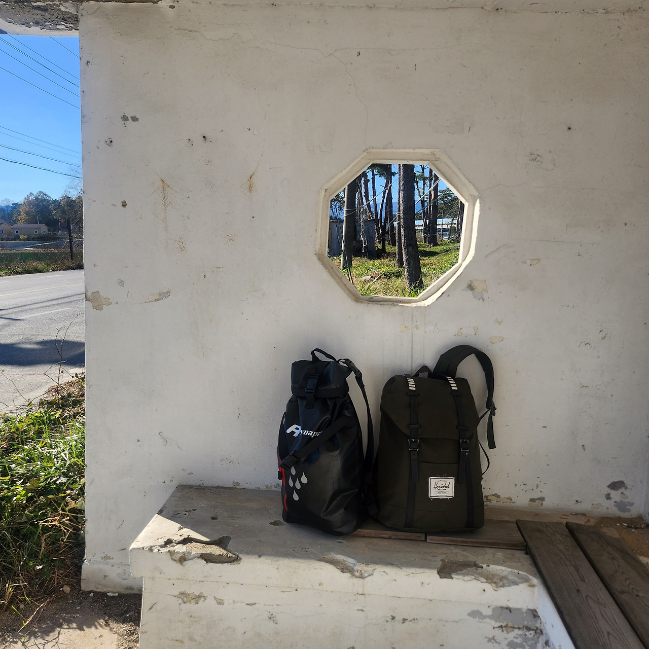 뜨거운 가을 햇빛을 가려줬던 오래된 버스 정류장과 여행을 함께 했던 배낭 2개