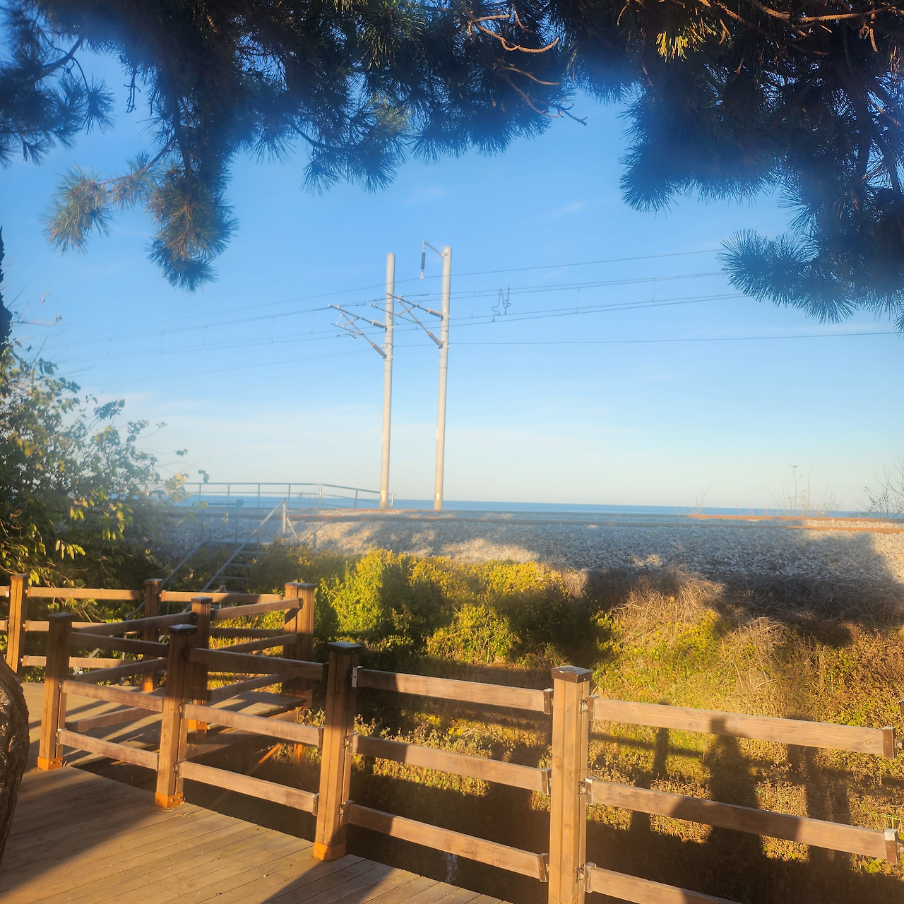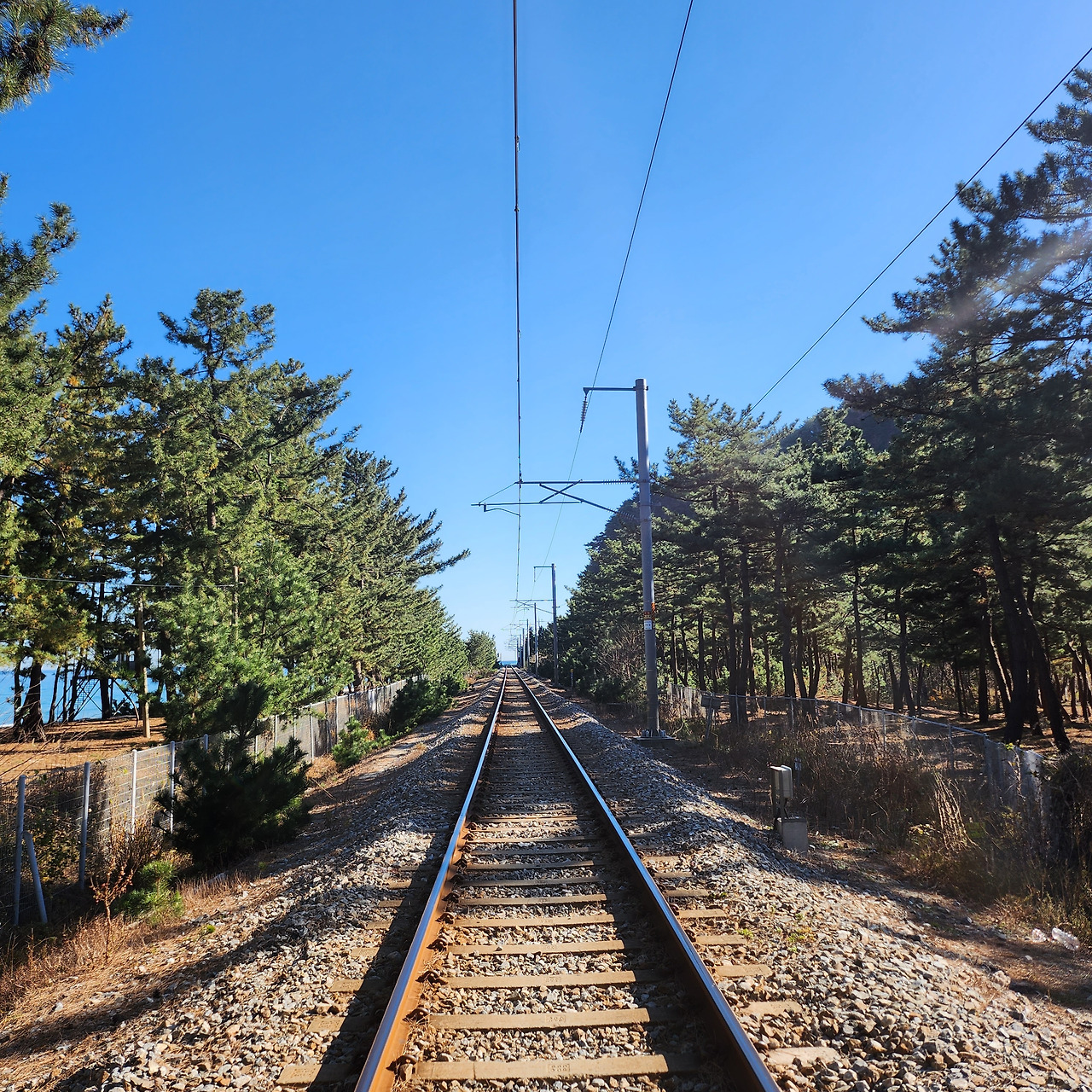 앞뒤로 배낭을 메고 다시 길을 나섰다. 내리막 차도 옆에 좁지만 자전거 길이 분리되어 있어서 전날과 달리 편안한 마음으로 두리번두리번 주변을 돌아보며 여유롭게 정동진 역으로 걸었다. 내리막 길 끝 해변이 나타났고 그 앞에 기찻길이 놓여 있었다. 규칙적인 간격으로 놓인 차가운 철로, 그 밑에 깔린 울퉁불퉁한 회색빛 돌, 그 위에 서면 멀리 보이는 소실점으로 모두 사라져 버린다. 그 끝에는 평범한 기차역이 있을 걸 알면서도 뭔가 다른 세상이 존재할 것 같은 오묘한 기분 혹은 바람에 기찻길 위에 올라서면 이상하게 설렌다.