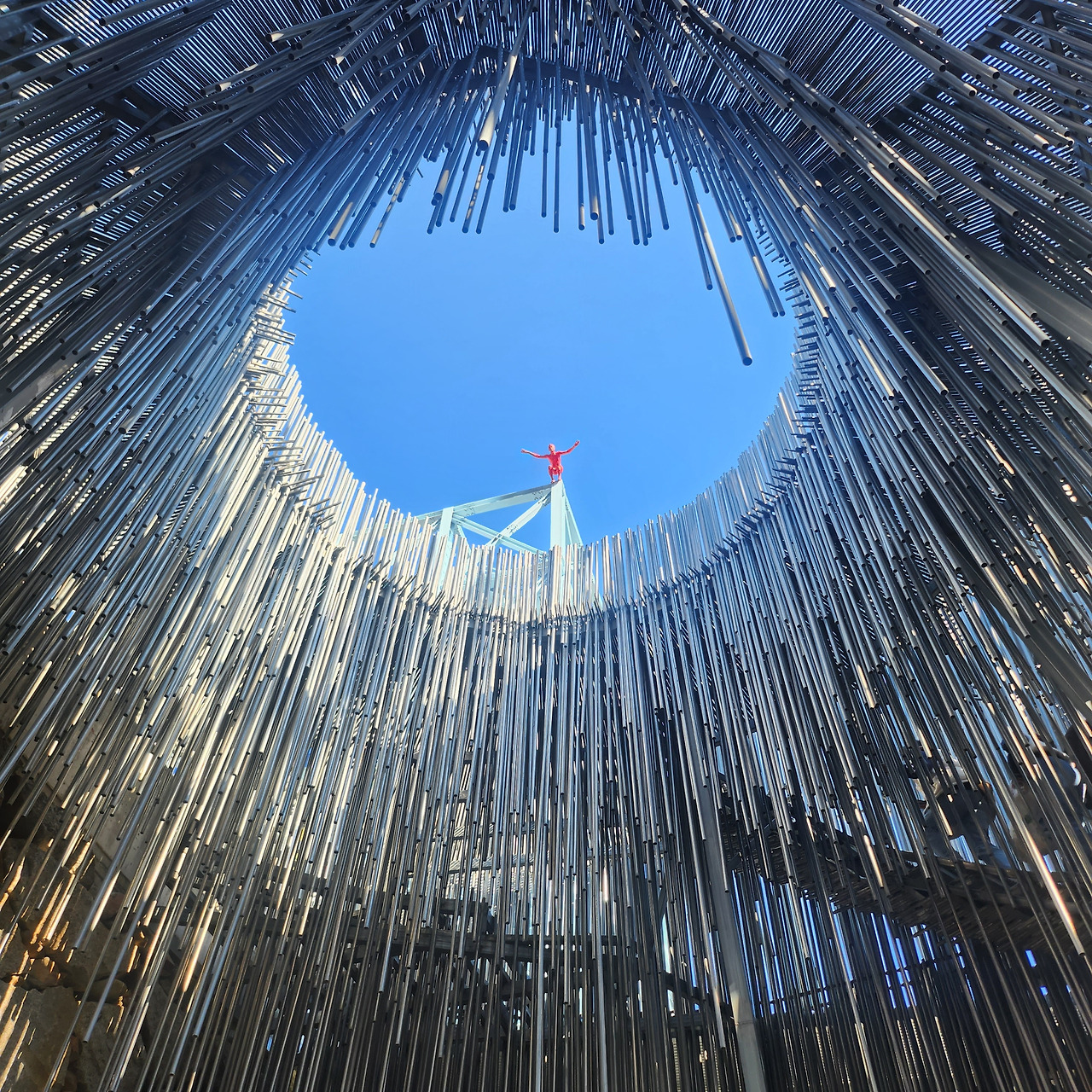 특정 위치에 서야만 보이는 모서리 끝에 앉은 빨간색 사람 조형물