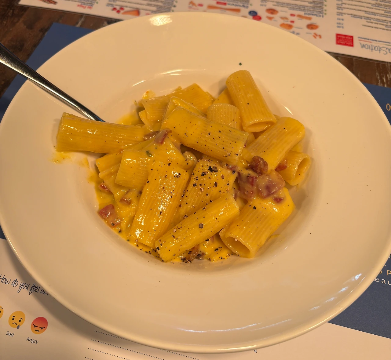 까르보나라 광인이었던 그 시절의 나는 리카토니 건면과 까르보나라 소스를 택했다. 꽤나 괜찮은 외관에 기대했던 것도 잠시, 파스타는 의심할 여지없이 끔찍한 영국의 맛이 났다.