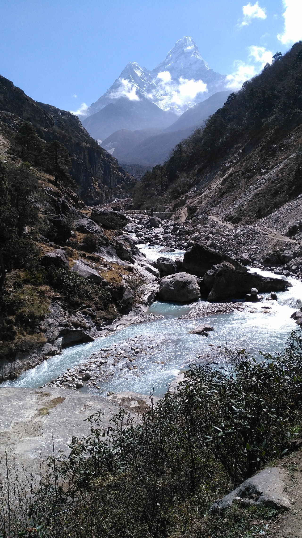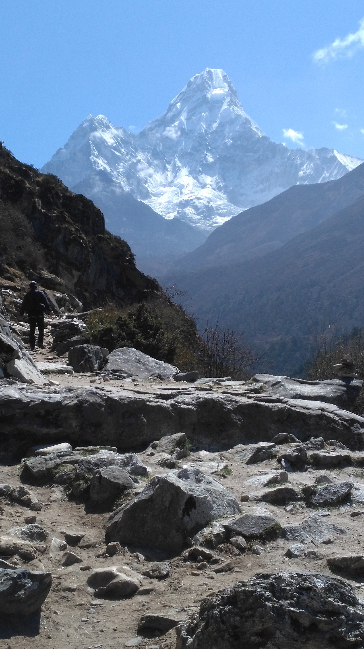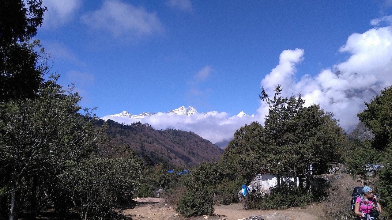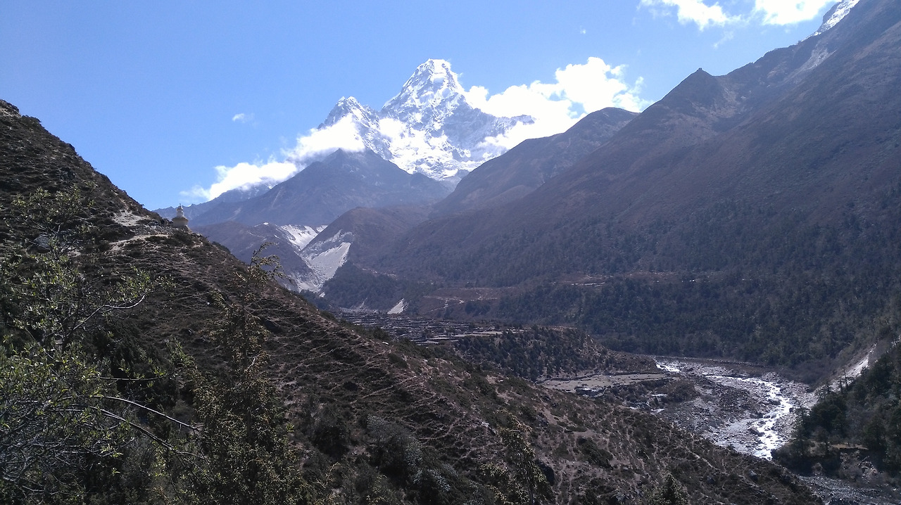 이제부터 히말라야 산들의 정상부들이 보이기 시작했다. 정상들은 다 빙하로 덮여있다고 했다. 잘 기억은 안 나지만 저기 보이는 저 봉우리는 아마다블람 일 것이다.
