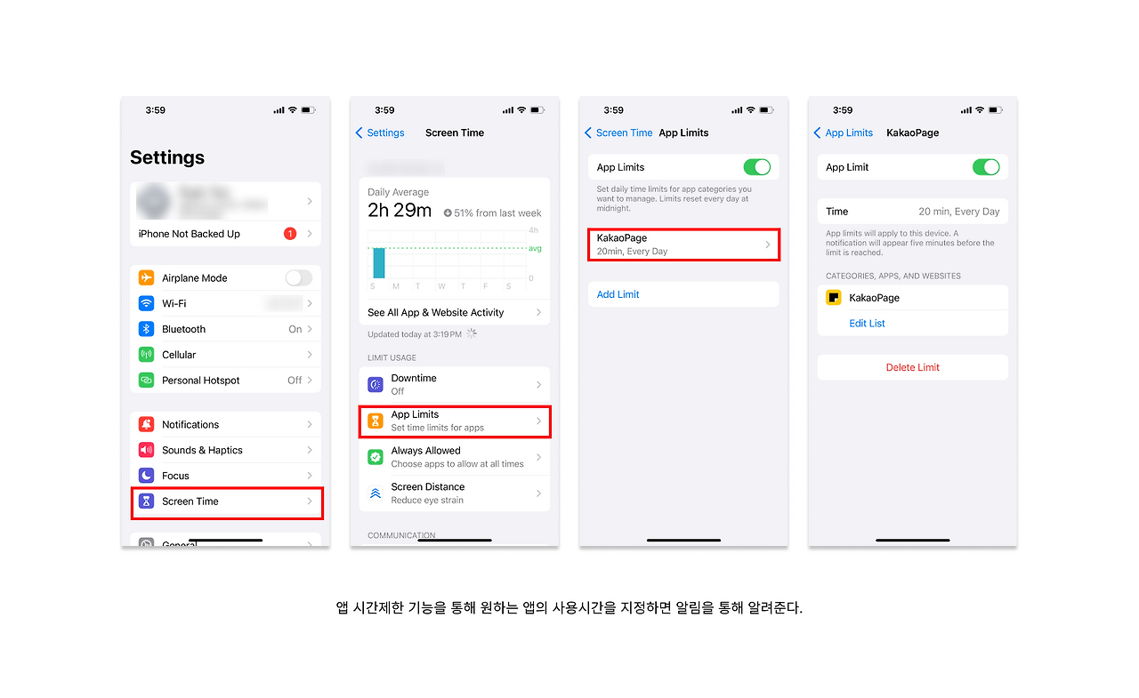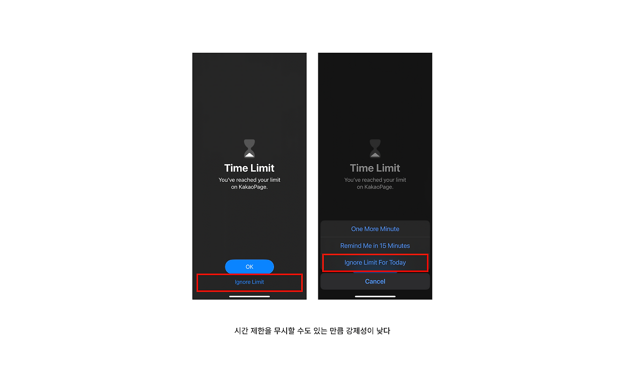 안 쓰는 것보다는 낫지만 실질적으로 사용자가 스스로 앱 사용을 적절하게 제한하는데 도움을 줄 수 있는지는 의문이다. 처음 선택한 타임에서도 다시 시간을 늘릴 수 있는 만큼 강제성이 약하기 때문에 사용자의 의지력에 많은 의존을 하는 기능이기 때문이다.