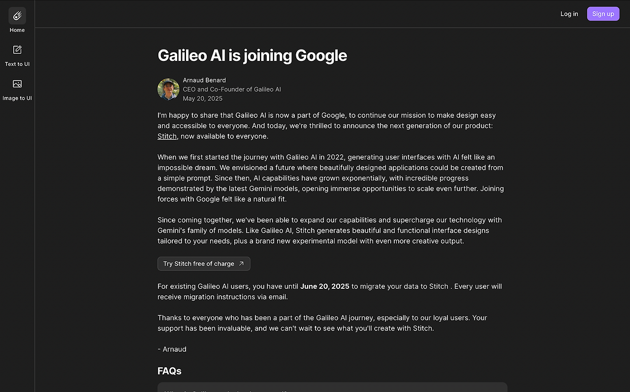 UI 디자인 AI는 보통 Uizard,Galileo를 많이 사용한다. 최근 구글이 galileo를 인수하면서 'stitch'라는 서비스를 론칭했으며, 현재는 베타 서비스로 운영되고 있다. 기본적으로는 'galileo'의 UX를 이어가고 있는 것으로 보인다.