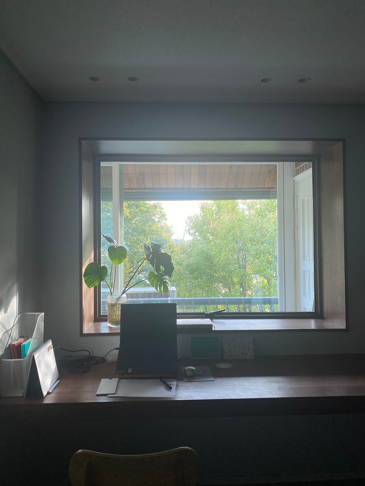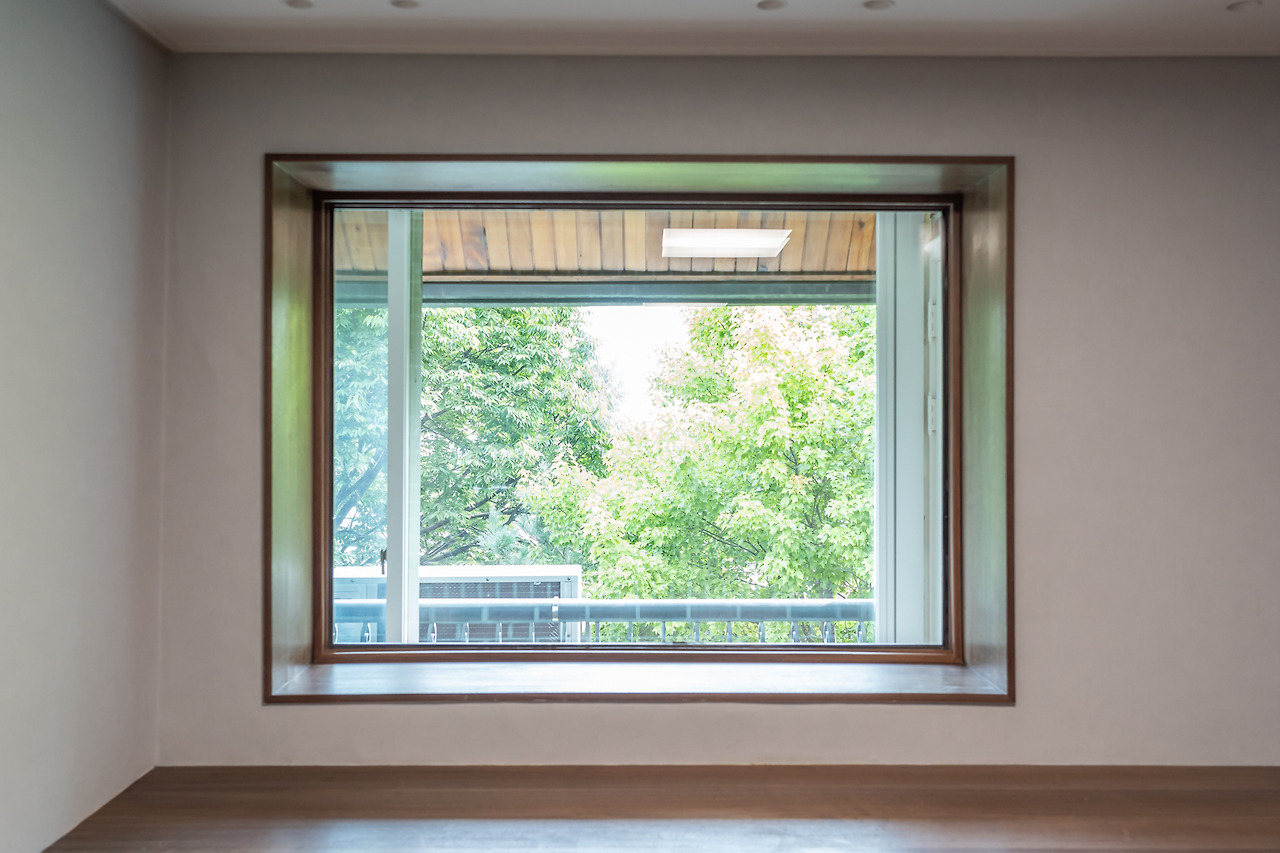 베란다 외창의 크기로 인해 안쪽에 통창을 한들 바깥 창의 문틀이 정가운데에 떡 하니 버티고 있었다. 뷰도 좋지만 한도 끝도 없이 돈을 쓸 수는 없기에 바깥창의 새시는 그대로 사용하되 좌우 위치를 바꾸기로 했다. 다행히 왼쪽으로 큰 창, 오른쪽으로 작은 창의 배열이었기 때문에 좌우를 바꾸면 방 안에서 보이는 오른쪽 창이 큰 창이 되어 못생긴 문틀은 최대한 가장자리로 몰아낼 수 있었다.