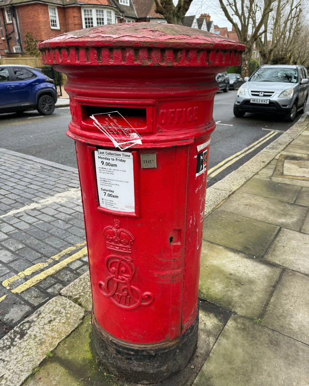 영국의 빨간 우체통은 의외로 길에서 쉽게 마주친다. 이벤트가 있으면 편지나 카드를 보내는 문화가 많이 남아 있어서 그런지 편지를 수거하는 주기도 월요일에서 토요일까지 매일이다. 영국 우체국의 공식 명칭은 로열 메일 (Royal Mail)이다. British mail이나 UK mail처럼 국가명을 사용하지 않고, 왕실을 의미하는 Royal을 사용하는데, 영국의 우편 시스템이 1516년 헨리 8세 때 왕실에서 사용하기 위해 만들어졌기 때문이다. 국민 모두가 사용하게 되었음에도 서비스 명칭은 여전히 역사적 이름 그대로 Royal Mail이다.