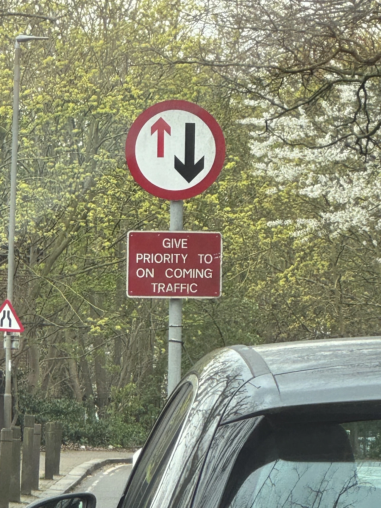 새순이 돋아나서 연두색으로 변한 가로수들 사이에 빨간색과 파란색의 교통 표지판이 생동감을 더한다. 런던의 교통 표지판을 보다 보면 종종 친절한 안내 문구가 적혀있는 표지판을 만날 때가 있다. '반대 차선에서 오는 차에게 우선권이 있으니 양보하라'는 이 표지판도 그러하다. 이런 건 표지판이 없어도 운전자들이 상황에 따라 알아서 판단할 수 있지 않을까 싶다가도, 조금 더 다툼 없는 운전을 위해 만들어진 표지판은 아닌가 하는 생각도 들게 한다.