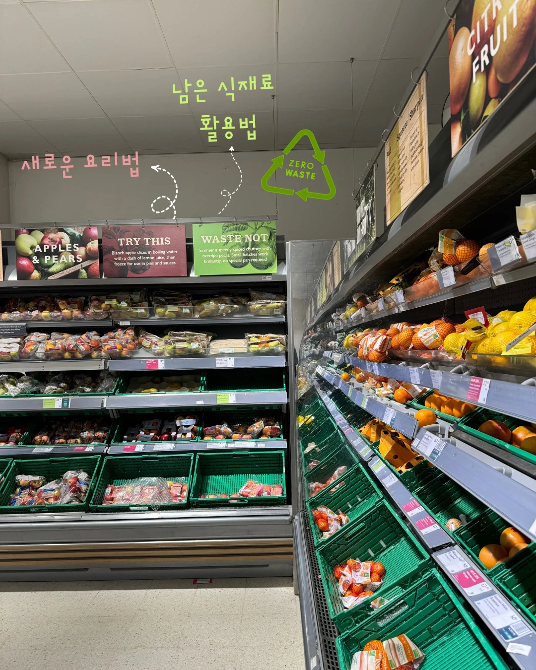 지속가능성에 대해 공부를 하면서 늘 선두주자로 손꼽히는 유럽은 어떻게 실생활에서도 지속가능성을 실천하는지 궁금했었다. Waitrose와 같은 슈퍼마켓에서는 진열된 제품이 최대한 많이 팔릴 수 있도록 과일별 레시피를 매대에 소개해 놓았고, 남은 식재료를 버리지 않도록 자투리 식재료 활용법도 소개해 놓았다. 또 다른 코너에는 "Too Good To Waste"(버리기에는 너무 아깝잖아요)라고 해서 유통기한 임박 상품들을 모아서 할인을 하고 있었다. 야채나 과일, 고기와 같은 식재료뿐만 아니라, 바로 데워서 먹을 수 있는 레토르트 식품과 샌드위치들도 있어서 간단히 한 끼를 해결하기 좋았다.