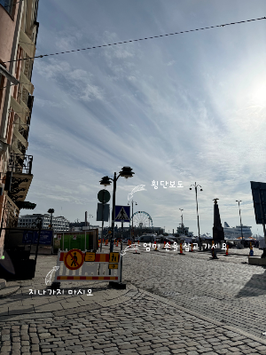 사진 속 거리는 헬싱키 대성당 앞 작은 길에서 마켓이 열리는 광장과 이어지는 골목 끝이다. 마켓으로 가려면 길을 건너야 하는데 횡단보도가 없다. 건널목을 찾고 있었는데 마침 표지판들이 눈에 띄었다. 인도 바닥을 공사하고 있어서 바리케이드를 세워놨는데 바리케이드에 붙은 표지판만 4개다. 노랗고 빨간 표지판들이 알록달록하다. 파아란 하늘이 배경이 되어주어서 더욱 돋보인다.