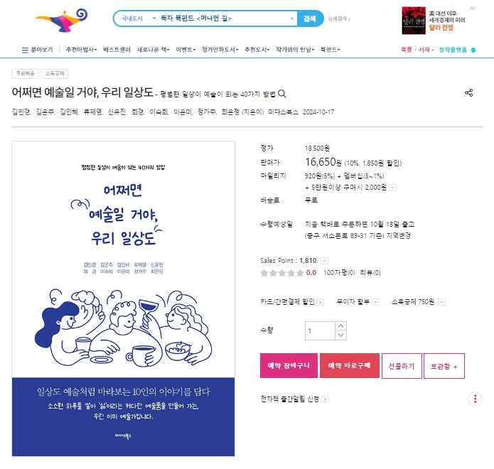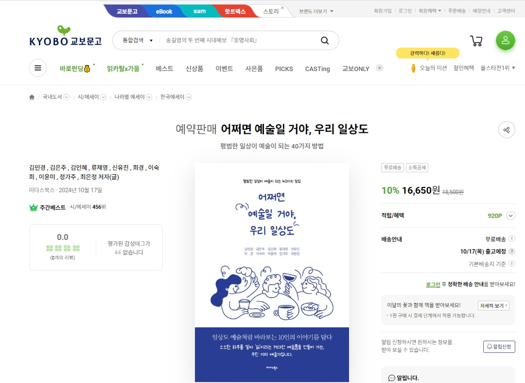 앗! 반가운 소식이 도착했다. 첫 공저책의 예약판매가 시작됐단다! 책 제목은 <어쩌면 예술 일거야, 우리 일상도>. 10명의 작가가 함께 쓴 책이다. 부제는 '평범한 일상이 예술이 되는 40가지 방법'. 교보문고, 예스 24, 알라딘에 검색하면 책이 나온다. 나의 글은 '희경'이라는 작가명으로 담겨 있다.