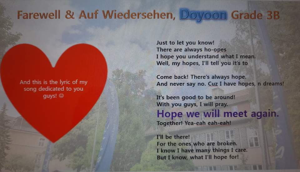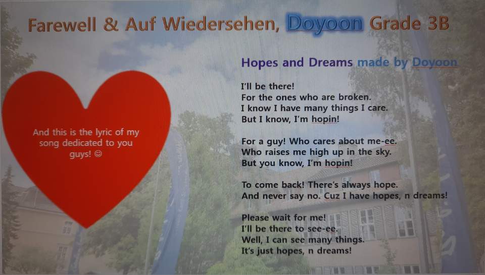 아이가 친구들을 위해 만든 굿바이 송 'hopes and dreams'의 가사를 보면 친구들, 선생님들과의 이별에 대한 아쉬운 마음이 곳곳에 드러나 있다.