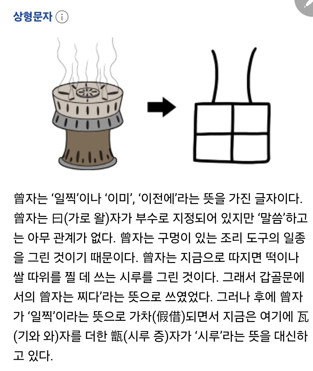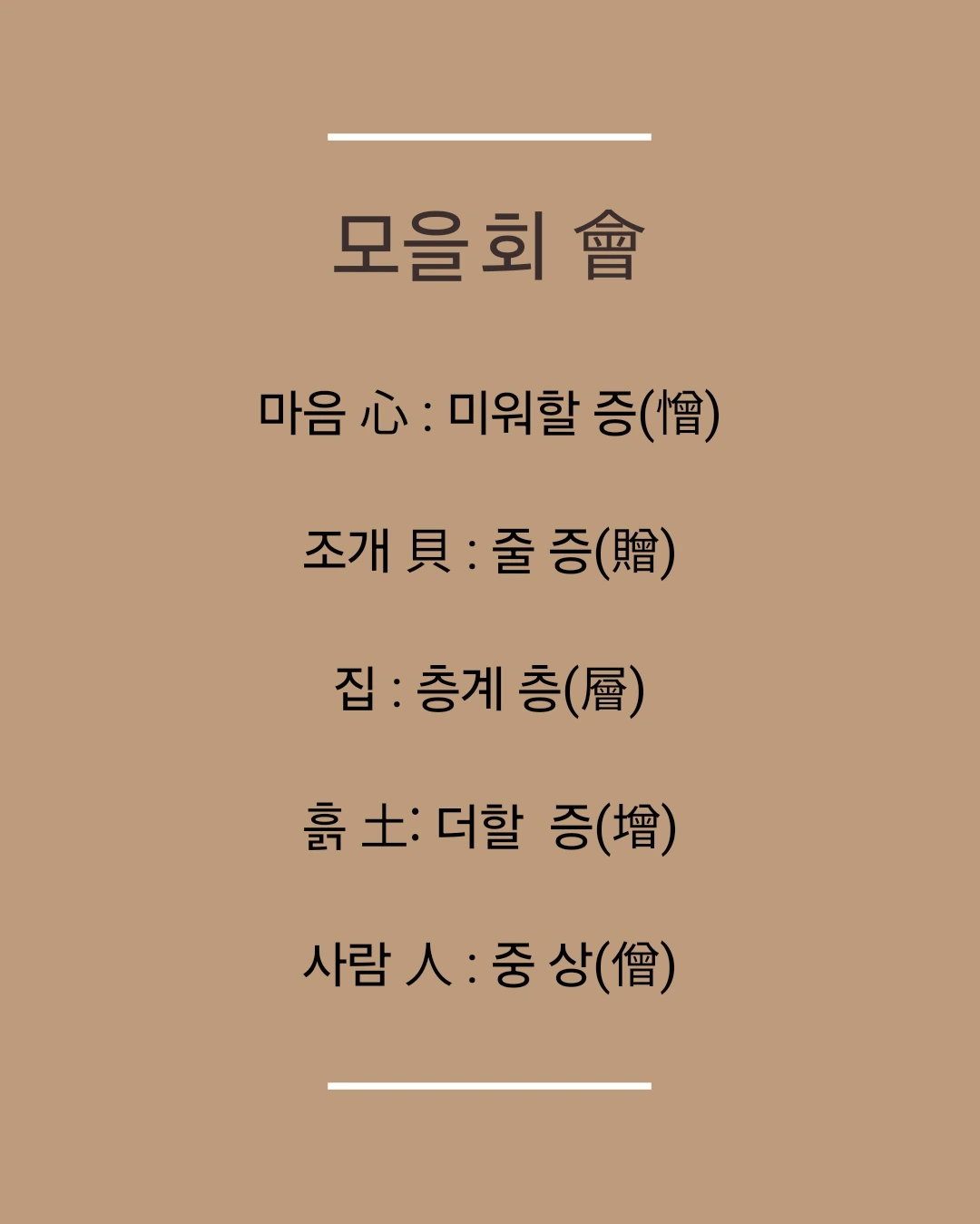 여기에 뚜껑을 더한 글자가 모을 회(會)이다. 뚜껑과 받침이 모여서 '서로 잘 들어맞는다'라는 뜻을 가진 글자이다. 그래서 '모이다'라는 '부합한다'라는 의미를 가지게 된 것인데 예전 떡을 만드는 과정을 상상해 보면 이 글자의 모양이 시루를 찌는 모습과 많이 닮았다는 것을 알 수 있다. 증기가 위로 올라가고 뚜껑으로 수증기의 증발을 막은 모습, 그 모인 뜨거운 증기로 떡이 쪄지도록 만드는 원리. 다시 말해 뚜껑이 잘 맞아야 증기가 빠져나가지 않고 내부의 쌀가루를 익힐 수 있게 되는 것이다. 뚜껑이 잘 맞지 않으면 떡은 익지 않게 되고 이는 잘 맞지 않고 부합하지 않는 것이 되는 것이다.