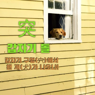 갑자기 돌(突) : 창문 구멍에서 갑자기 나타난 개를 나타내는 글자