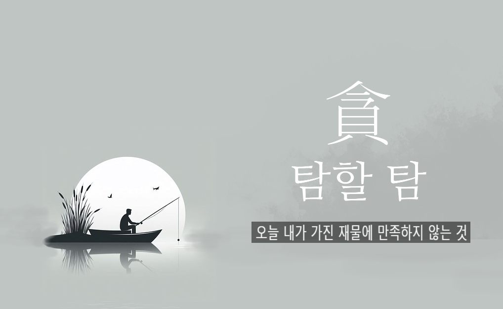 반면 탐내다는 뜻을 가진 탐할 탐(貪)은 오늘을 나타내는 글자, 이제 금(今)과 재물을 나타내는 글자, 조개 패(貝)로 이루어진 글자이다. 오늘 내가 가진 재물에 만족하지 않고 더 가지고자 욕심을 내는 마음이 탐욕(貪慾)인 것이다.