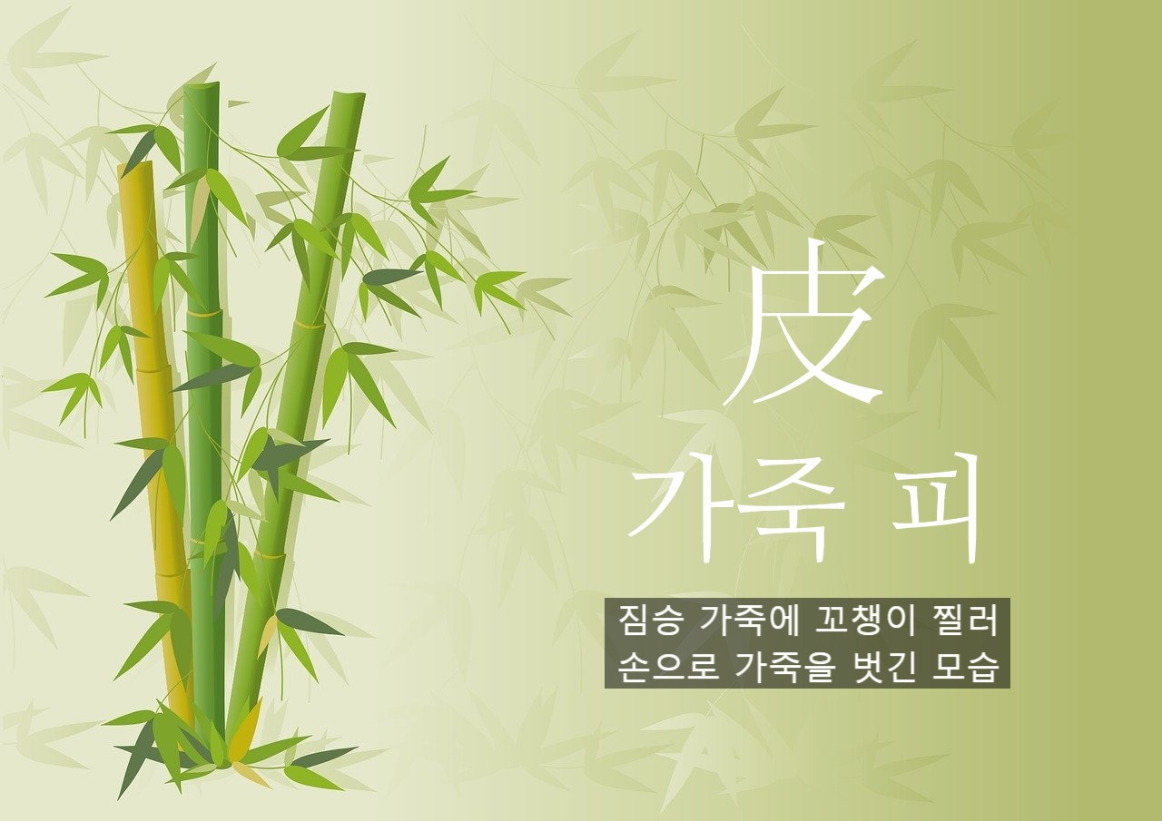 1. 의미 : 짐승의 가죽을 취한 것. 급하니 고기는 먼저 먹고 가죽을 꼬챙이로 찔러 말린다. 손으로 벗긴 모습입니다. 고기는 이쪽에 놓고 가죽은 저쪽에 던져둔다. 그래서 가죽처럼 벗겨져 떨어져 나간 사람이란 뜻이 있다. 이쪽(고기)에도 저쪽(가죽)에도 끼지 못한 사람을 그래서 어중간(於中間)하다라고 말한다.