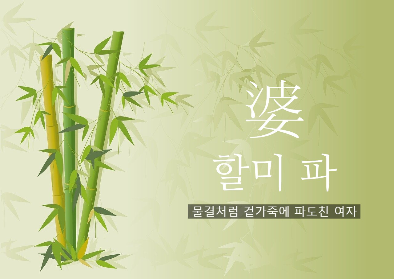 1. 의미 : 물결파에 여자를 더한 글자. 물결처럼 얼굴 겉가죽에 파도친 여자는 할머니.