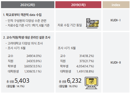 심지어 대학에서 단독으로 실시하는 설문은 그 대표성 면에서도 신뢰도를 갖춰가고 있습니다. 실례로 고려대학교 다양성 위원회에서 실시한 다양성 현황 조사에는 꽤나 많은 학우들이 참여했습니다. 2020년 설문에서는 외국인 유학생들의 1/3 이상이 참여했고 2019, 21년 설문에서는 재학생의 10% 이상이 설문에 참여했습니다.