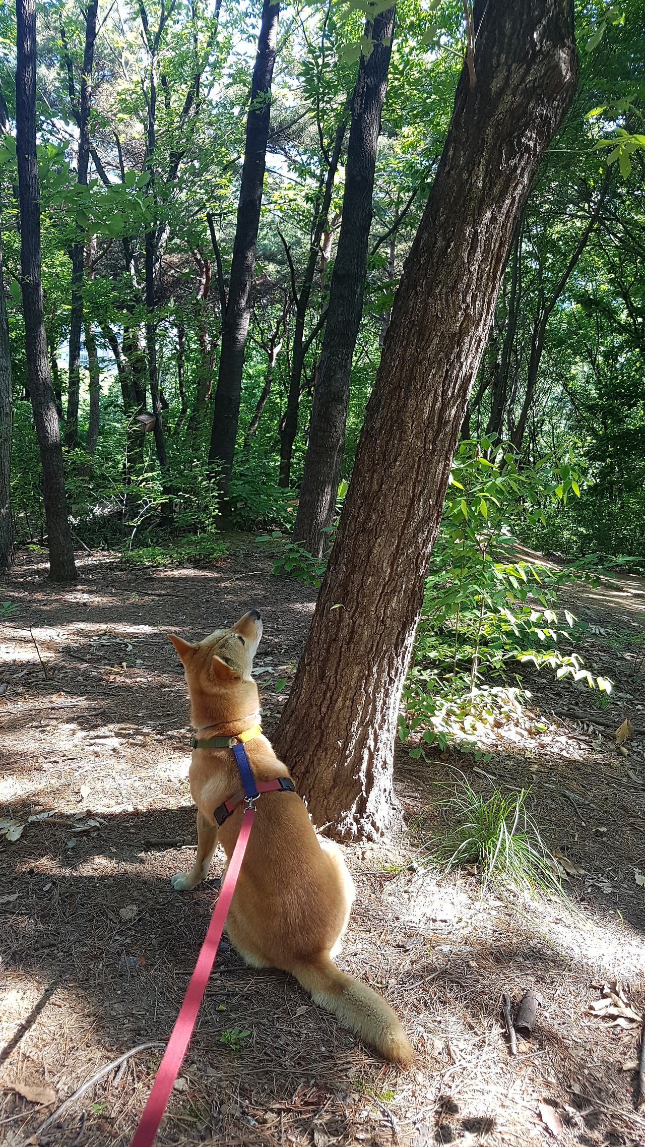 신기하게도 몽이가 멈춰서 나무 위를 바라보면 그때마다 다람쥐가 있었다. 높은 나무 위나 숲 속 나뭇가지 사이에 있는 다람쥐는 잘 보이지 않는데.. 그 때마다 몽이의 시선을 잘 따라가 보면 그 끝에는 반드시 다람쥐가 있다. 다람쥐들이 나무 사이를 뛰어다니고 높은 나무 위로 쪼르르 오르내리는 모습이 신기해서 나도 마냥 보게 된다. 하지만 다람쥐들은 그러다가도 결국 땅으로 내려온다. 떨어진 도토리를 찾아 또 집으로 가기 위해서... 그때를 기다리는 몽이.... 30분이 넘도록 꼼짝을 하지 않을 때도 있다. 강아지는 후각이 발달한 줄만 알았지 눈도 나쁘지 않은 것 같다. 몽이가 평소에 기다리는 걸 잘하지 못한다고 생각하는데.. 상황에 따라 다른가 보다. 그런 몽이를 보면 산책하시는 분들이 보고 다들 한 마디씩 한다. '강아지가 뭐 보고 있어요?'. '다람쥐가 있어요?' '강아지가 집중력이 좋네~' 신기해한다. 누가 오거나 말거나 꼼짝을 안 하니... 덕분에 나도 가을 구경을 한다. 가을 하늘, 가을 나무, 가을 숲길.. 가을 낙엽 소리들..