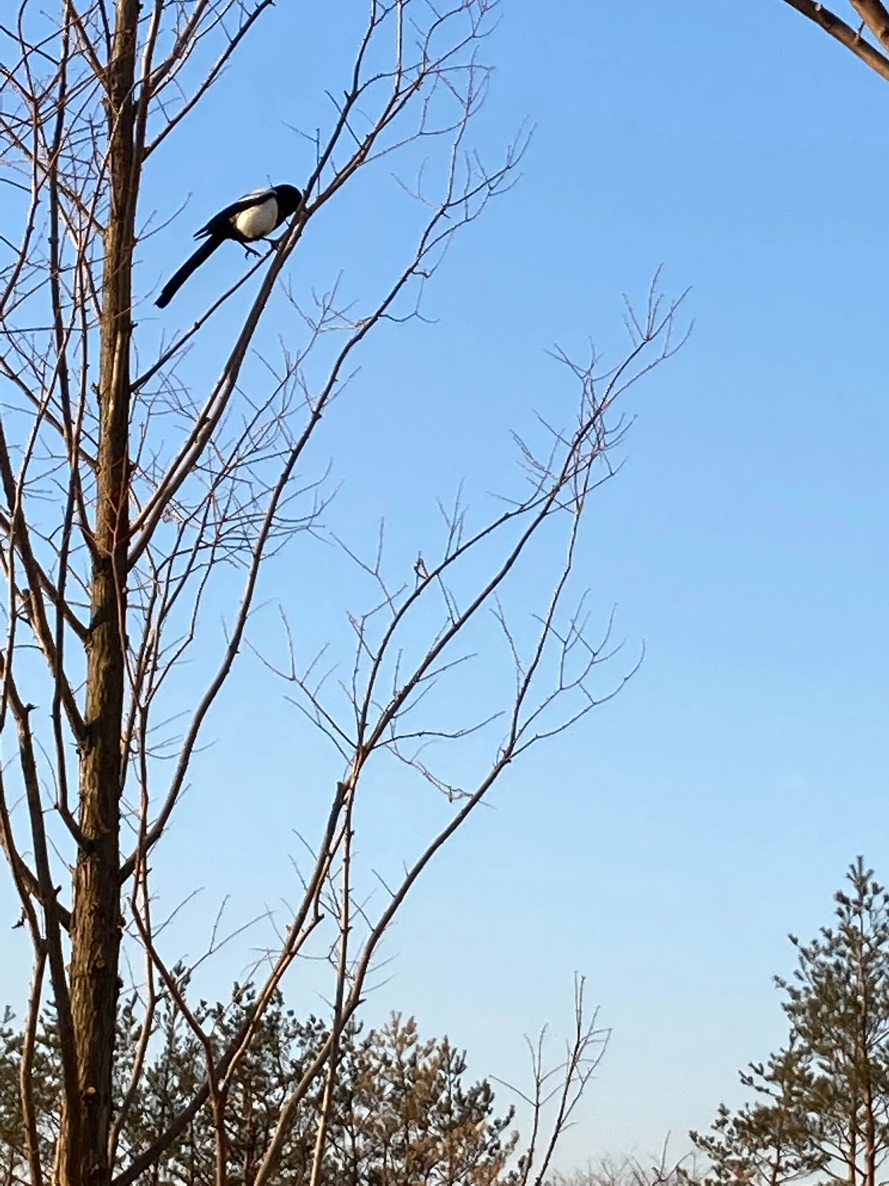 갑자기 까치 두 마리가 '깍깍' 울기 시작한다.