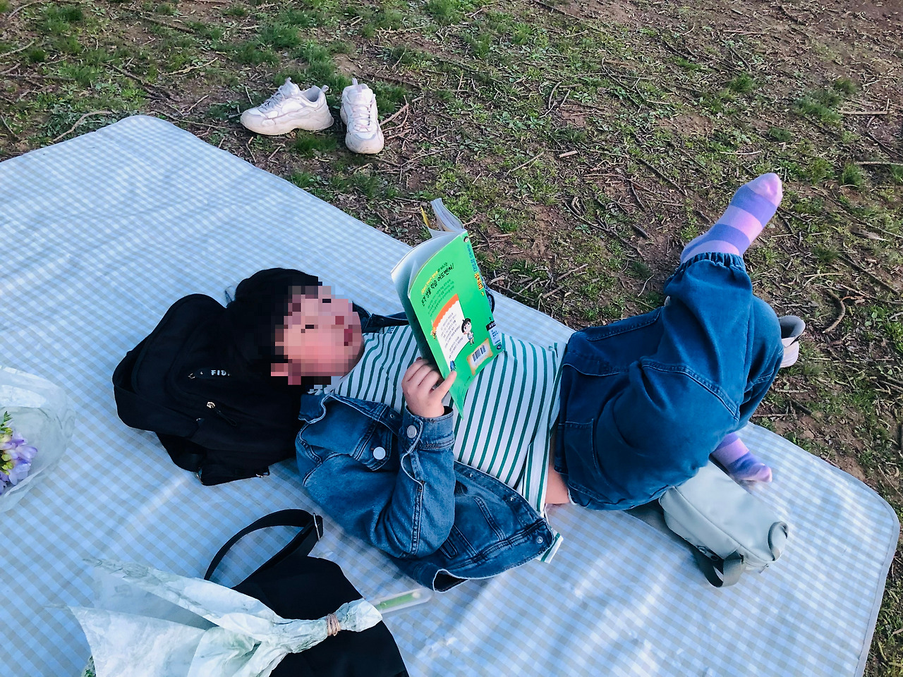 첫째 아들은 가방을 머리에 대고 바로 누워서 책을 읽는다.