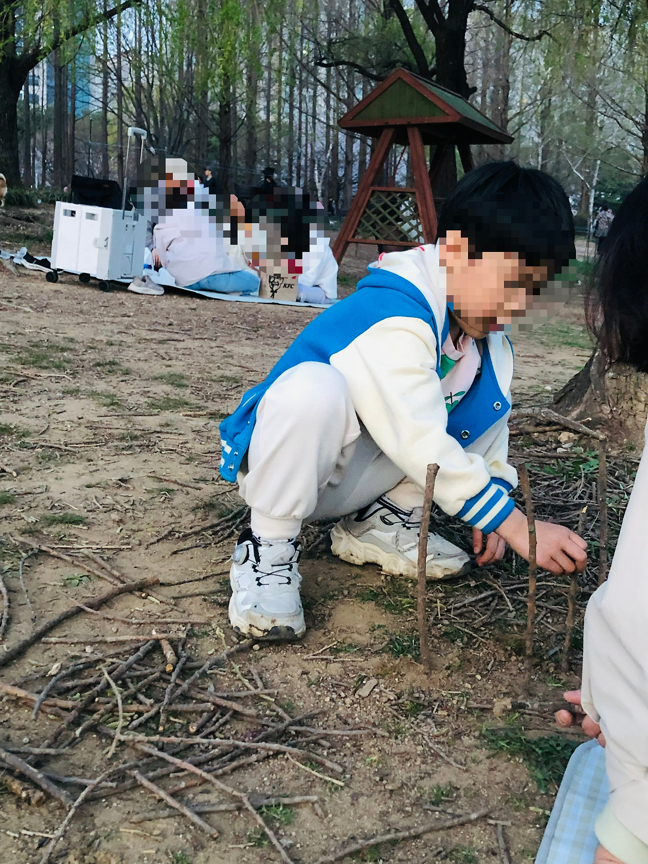 근처에서 나뭇가지를 주워와서 뭔가를 만든다고 쪼그려 앉아 있다.