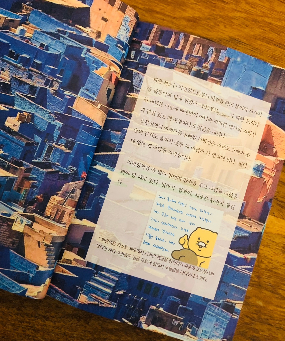 여행하면서 그 여행지의 색깔을 생각하고 그것과 어울리는 글을 쓴다는 것이 쉽지는 않을 텐데, 세심하게 바라보고 그 속에서 많은 생각을 한 결과겠죠. 저는 여행을 가도 일상의 탈출구 같은 것이었기에 그냥 구경하고 사진 찍고 그게 다였던 것 같아요. 여행하면서 느꼈던 감정들과 색깔들을 기록한다면 하나의 멋진 작품을 누구든 완성할 수 있겠다는 생각이 들었어요. 나만의 여행 컬러 에세이집을 만드는 거죠. 그러기 위해서는 여행을 많이 해야 하는데... 일상에 묶여있다 보니 쉽지는 않네요. 꼭 멀리 가는 것만이 여행인가요? 가까운 곳에 가더라도 여행한다고 생각하고 간다면 그곳은 모두 설렘을 간직한 여행지가 되지 않을까 싶어요.