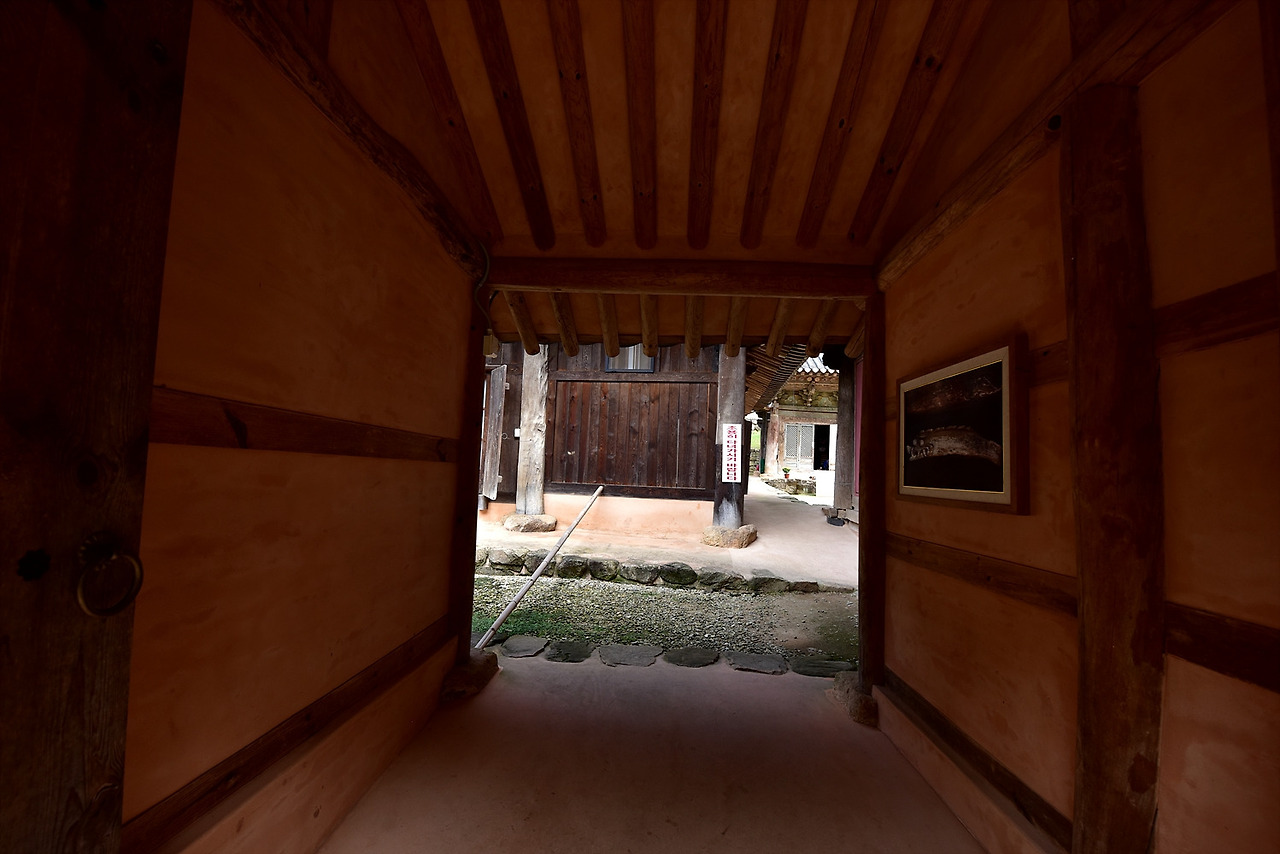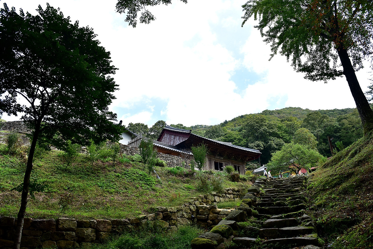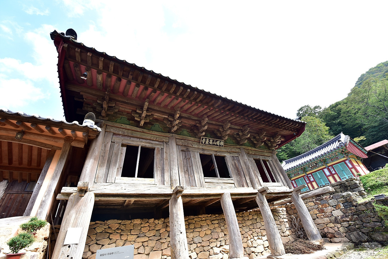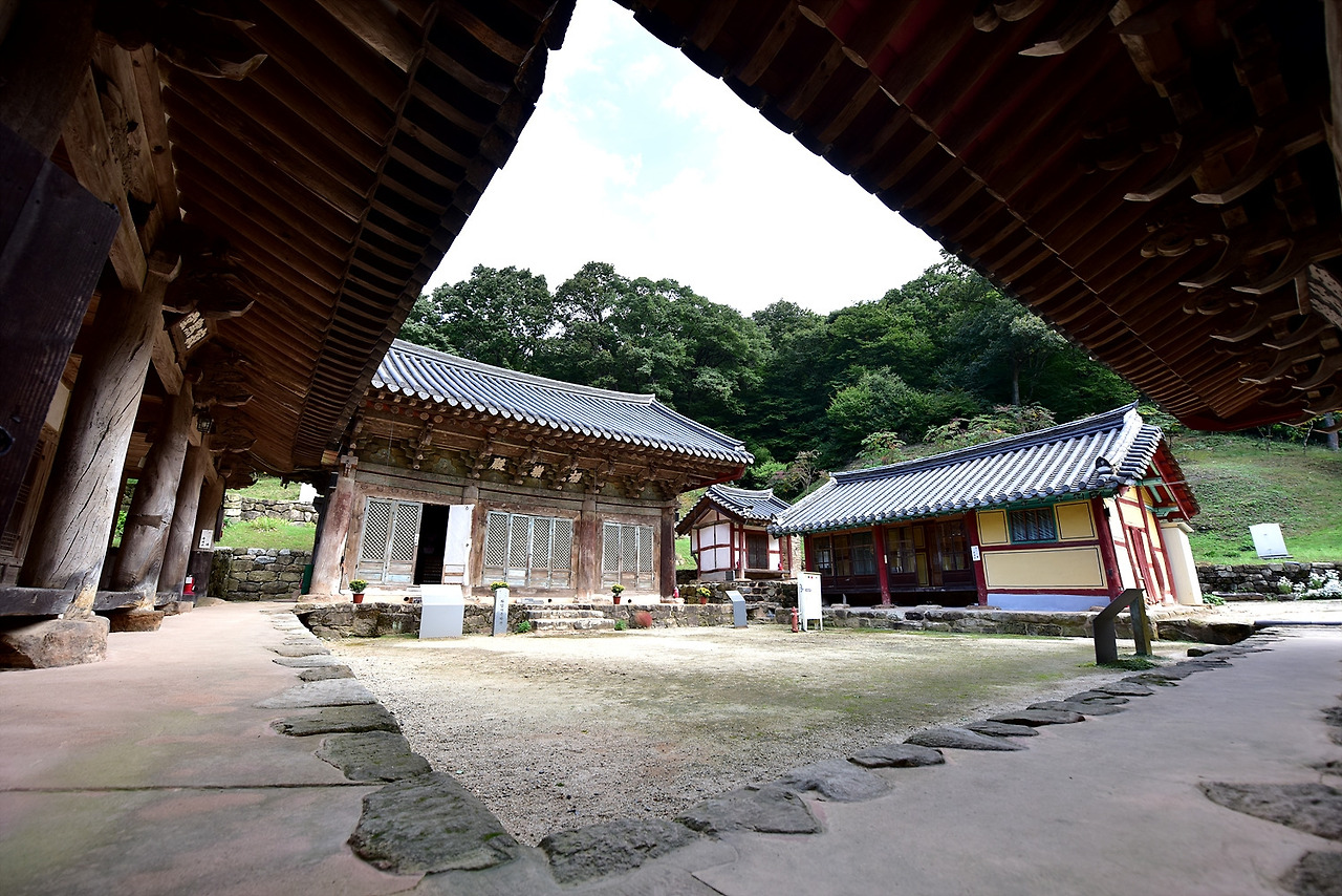 우화루를 올라 정면으로 보이는 건물이 극락전이다. 아미타삼존여래좌상을 모신 극락전은 국보 제316호다. 국내 유일의 하앙식(下昻式)구조 목조 건물이다. 극락전 지붕을 올려다보면 일반 처마보다 훨씬 길게 처마가 나와있다. 하중을 분산시키기 위한 건축 방식이다. 요사채인 적묵당 툇마루에 앉아 숲 속 고요한 사찰을 음미한다. 앞서 가던 부부는 극락전에 들어가 예불을 하고 있다.