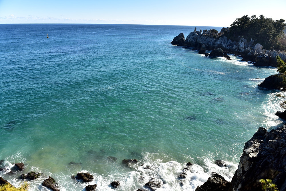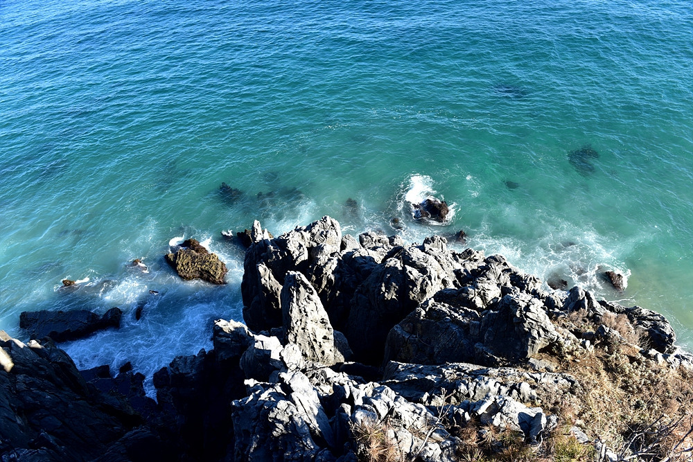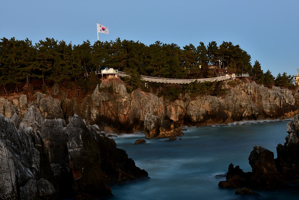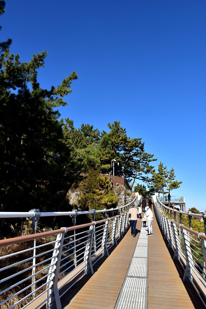 추암촛대바위 해안에서 미적거리다 9시가 되어서야 출렁다리로 향한다. 다리를 건널 수 있는 시간은 아침 9시부터 저녁 8시까지 정해져 있다. 너무 춥다 싶으면 근처 카페에서 커피 한잔으로 동해의 아침을 즐겨도 좋다. 출렁다리는 길이 72m, 폭 2.5m로 바다 위를 가로지른다. 크게 출렁거리지는 않지만 그래도 흔들리긴 한다. 다리를 건너다 아래를 내려다보면 파도와 포말이 발아래에서 요동쳐 긴장감을 일으킨다. 비취색의 짙고 옅음이 바다라는 도화지 위에 뿌려진다.