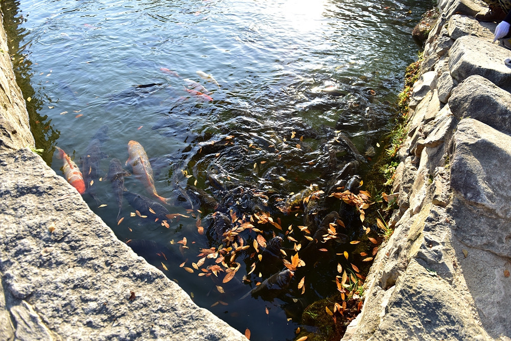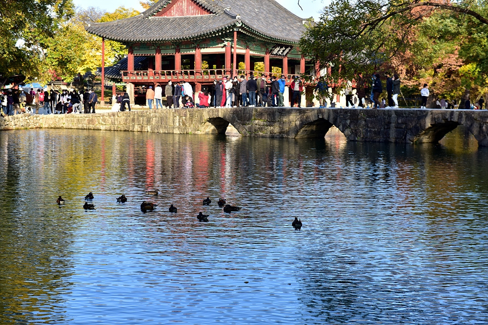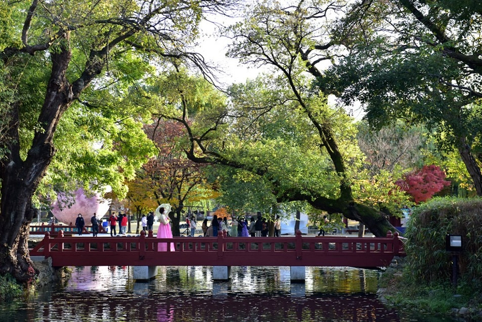 광한루원은 어느 계절에 가도 운치있지만 특히 가을색이 예쁘다. 광한루원 앞에는 호수와 호수 속에 3개의 섬(삼신산)이 떠있고 호수를 가로지르는 오작교가 있다. 은하수를 상징하는 연못, 월궁은 광한루원이고 땅의 낙원이 삼신산이다. 한라산, 금강산, 지리산을 상징하는 3개의 섬은 목조다리로 연결되어있다. 언젠가 연결될 우리나라의 명산들이다. 월궁 앞 은하수를 가로지르는 오작교를 건너다 보면 커다란 잉어들이 먹이를 달라고 입을 뻐끔거린다. 물속이 아니라 천계를 날아다니는 물고기같다.