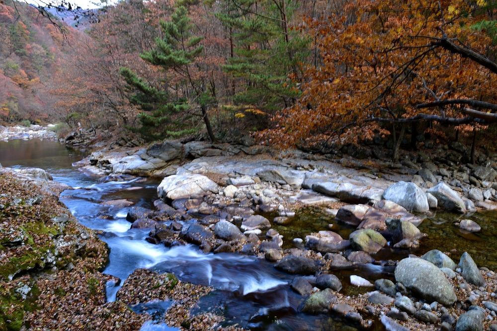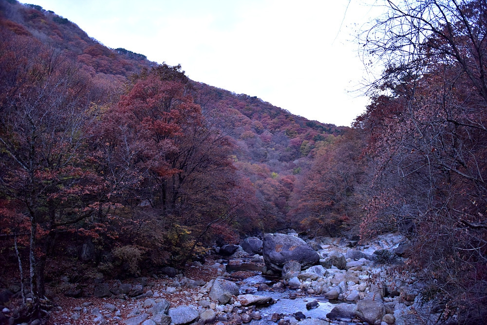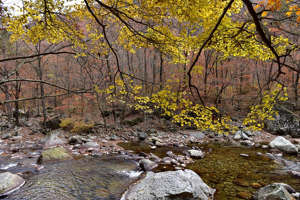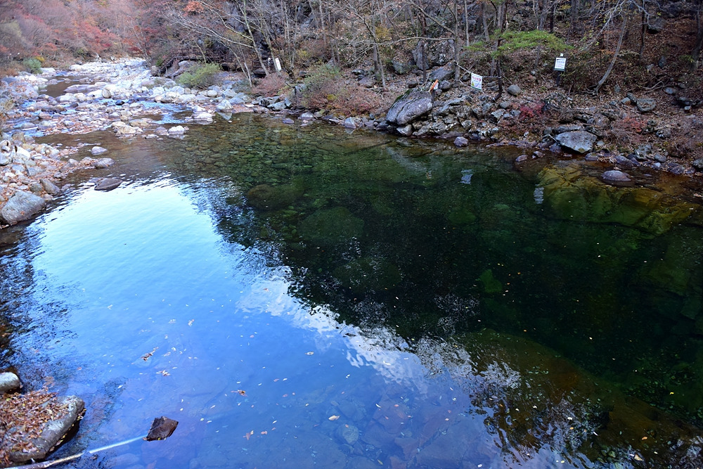 이번 가을 여행의 콘셉트는 가을 산 산책이다. 뱀사골 계곡 탐방을 하기 위해 뱀사골힐링야영장주차장에 차를 세우고 뱀사골 입구로 향한다. 무장애 탐방로를 따라 조금 늦은 감이 있는 가을여행을 떠난다. 뱀사골은 뱀(이무기)이 죽은 골짜기라는 의미다. 이무기에게 잡아먹힌 중이 신선이 되어 올라갔다 하여 뱀사골 입구는 반선 마을이라 불린다. 이곳에서 반야봉까지의 계곡 약 14km가 뱀사골 계곡이다. 크고 작은 폭포와 소, 널따란 바위 등 뛰어난 자연 풍광이 계곡을 끼고 걷는 내내 새로운 느낌으로 다가오는 명품 계곡길이다.