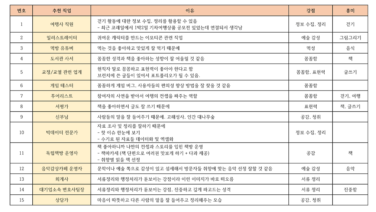 지난 상담 이후 이어진 2차례의 상담에서 나는 내가 흥미를 가지고 하고 싶은 일들과 주변 친구들이 생각한 나에게 어울리는 직업을 취합한 결과로 이야기를 나누었다. 친구들이 이야기해 준 내용들은 다음과 같다.