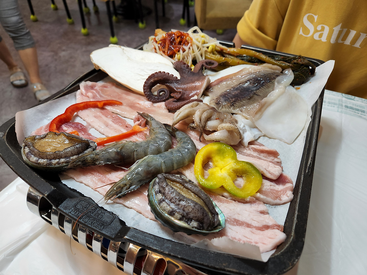 오전과 오후 시간을 야외에서 보낸 후유증은 상당히 컸다. 숙소에 돌아와서 저녁 먹기 전까지 내내 잠이 들었다. 평소에 그렇게 운동을 하는데도 더위를 이기는 건 나에겐 참 힘든 일이었다. 저녁은 여수에 왔으니 한끼 정도는 해물을 먹어보자 해서 해물삼합(돌문어, 오징어, 삼겹살, 전복, 새우 등)을 먹으러 갔다. 저녁 일정은 정말 저녁만 먹고 끝냈다. 내일의 내가 여수의 또 다른 멋진 곳으로 기운 내서 다닐 수 있도록 컨디션을 조절하기로 했다. 야외 데이트를 여러번 하면서 더위로 고생했던 경험을 통해 '여행 왔는데 시간이 아까우니 알차게 일정을 보내보자!'는 것 보다 내 몸의 건강이 우선임을 잘 알게 되었다. 여름에 야외에 다니는 건 조심해야 함을 다시 한번 느끼게 하는 날이었다.
