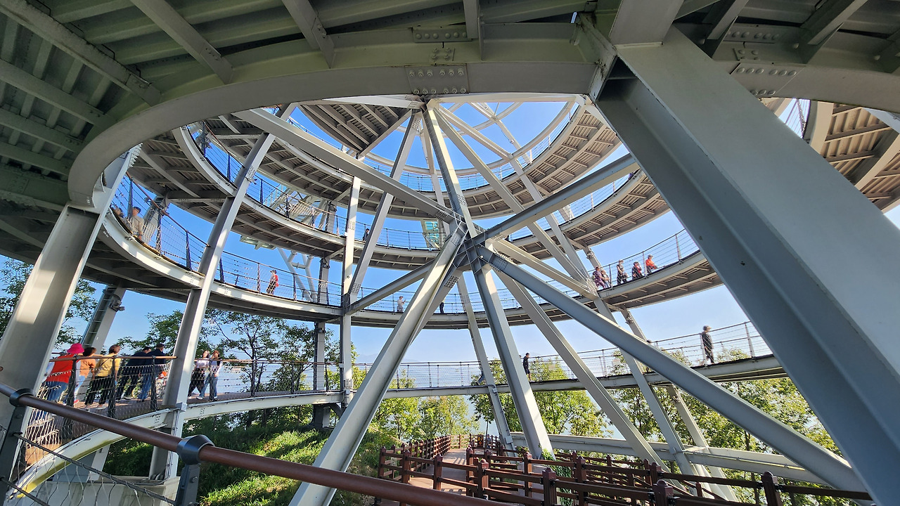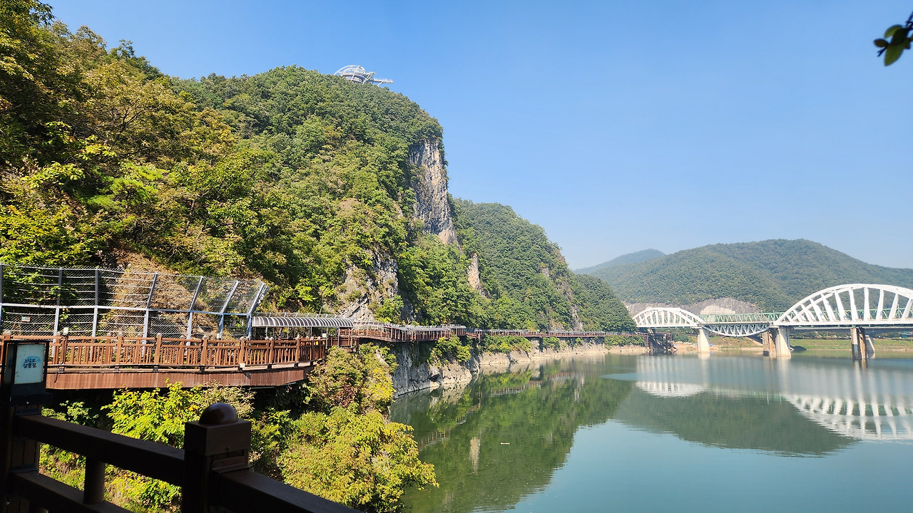 단양강 잔도길 단양 시내 입구를 나가는 길에 높진 않지만 가파른 절벽을 따라 단양강 잔도길이 있다. 데크길이 설치되어 사이사이 뚫려있는 바닥 틈으로 강이 보이는데 떨어질 것 같은 느낌에 소름이 돋았다. 이런 느낌이 싫어서 잔도길을 빠른 걸음으로 지나갔다. 잔도길을 지나고 나온 매표소에서 전망대 입장권을 사서 셔틀버스에 올라탔다. 탑승인원이 어느 정도 차니 버스가 출발했다. 매표소 출발 직후 바라본 전망대는 산 꼭대기 같은 굉장히 높은 곳에 위치해 있어서 가는데 오래 걸리겠다 생각했는데 구불거리는 산 길을 올라가고 얼마 지나지 않아 도착했다. 빙글빙글 올라가는 길을 따라 제일 위층에 도착하니 남한강에 폭 안겨 있는 아기자기한 단양 시내가 보였다. 주변에 강과 산이 둘러싼 모습을 보니 키 큰 건물들에 잔뜩 둘러싸여 있는 서울의 모습과 비교되었다. 자연과 잘 어우러진 모습을 사진에 잘 담고 싶어서 여러 방면에서 찍고 싶었는데 전망대 맨 위쪽은 유리 바닥으로 되어 있어서 걸어 다니는 것 자체가 긴장이 잔뜩 되어 힘들었다. 절로 '으.....' 하는 곡소리가 나왔다.