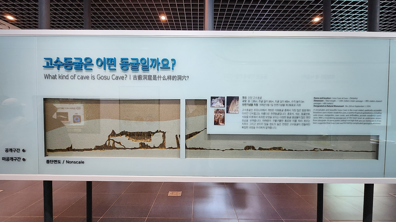 고수동굴의 단면도. 미공개된 구간이 굉장히 많다. 고수동굴에 들어가기 전 매표소 건물 안에 동굴에 대한 교육자료들이 전시되어 있는 구간을 둘러봐야 했다. 아직 미공개된 구간이 굉장히 길고 깊다는 것이 신기했다. 미공개된 구간이 공개되려면 그 구간에 고여있는 물들을 빼내야 갈 수 있다고 한다. 동굴에 들어가서는 신비롭고 거대한 자연에게 경외심이 들었다. 종유석이 날카로운 동물의 이빨 같기도 하고 동굴 안에 또 다른 작은 동굴의 세계가 있는 것 같기도 했다. 둥글둥글하게 깎여나간 부분도 있고 마구잡이로 깨져서 모가 난 부분도 있었다.
